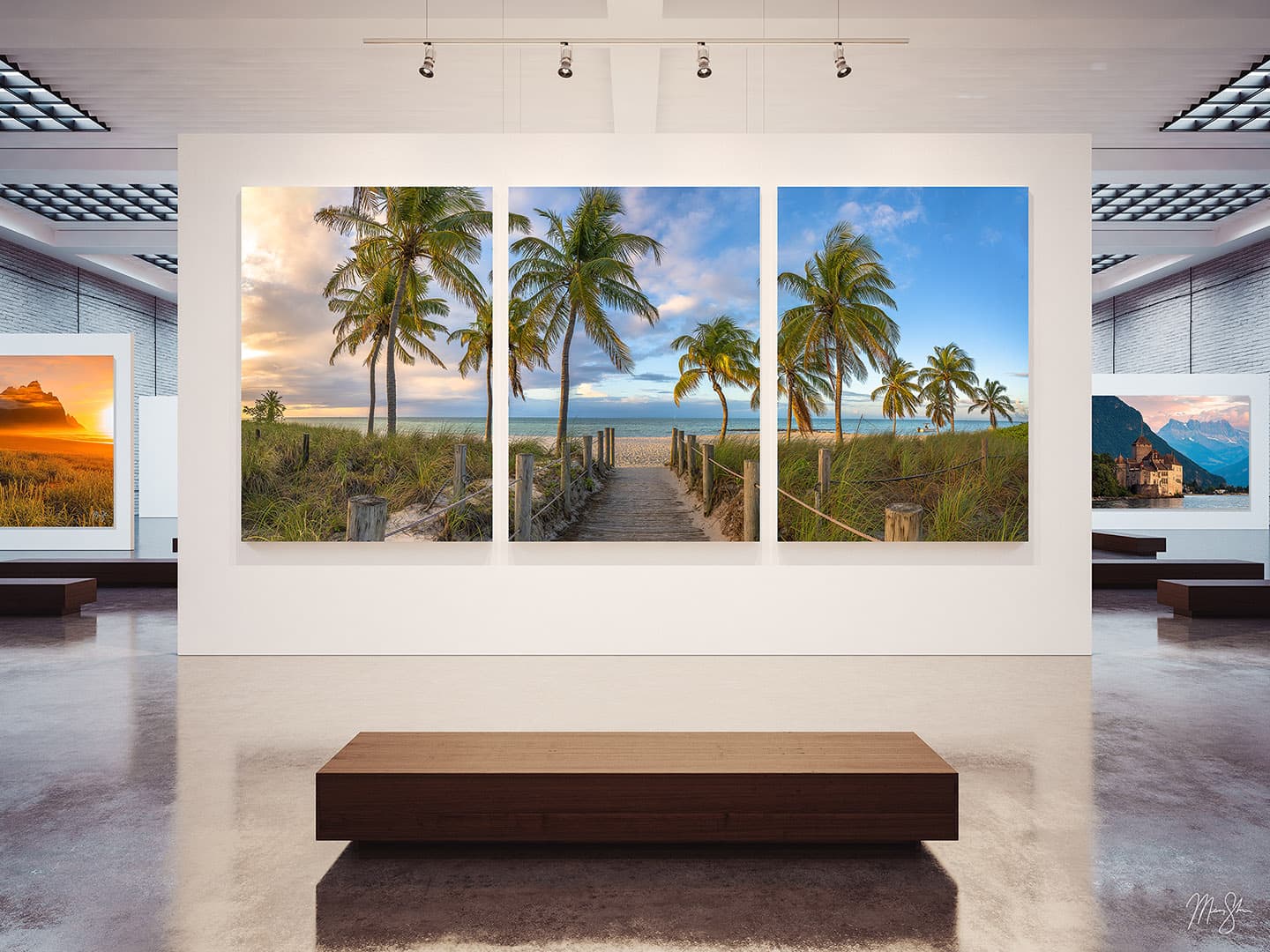 A triptych of Key West Sunrise under high end gallery lighting.