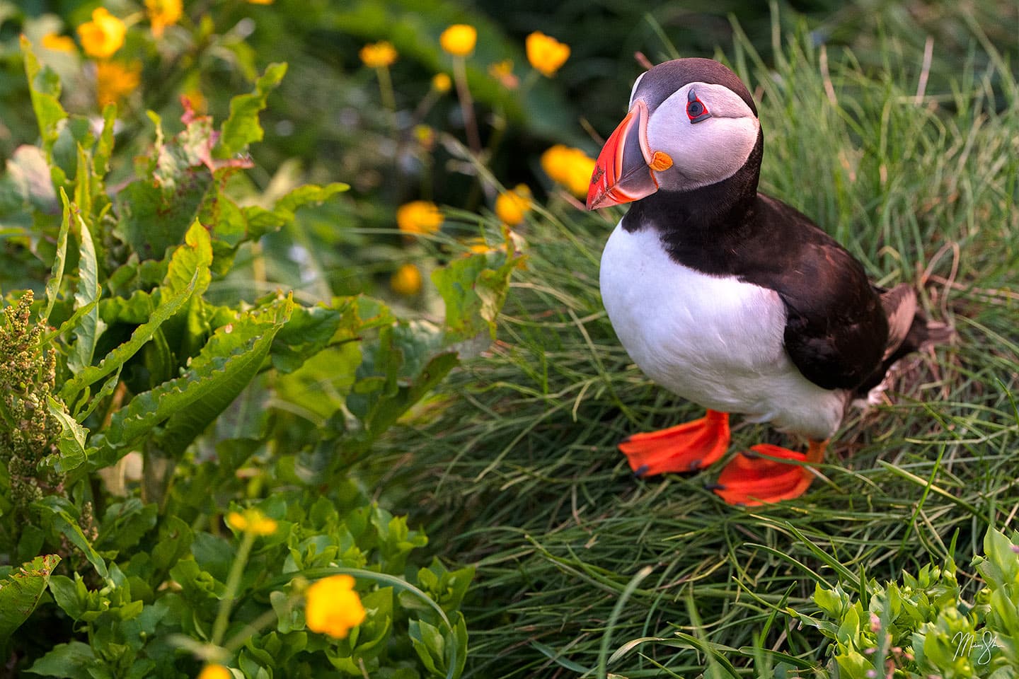 A little puffin shows off near the grass and wildflowers of Borgarfjordur Eystri in northeast Iceland.